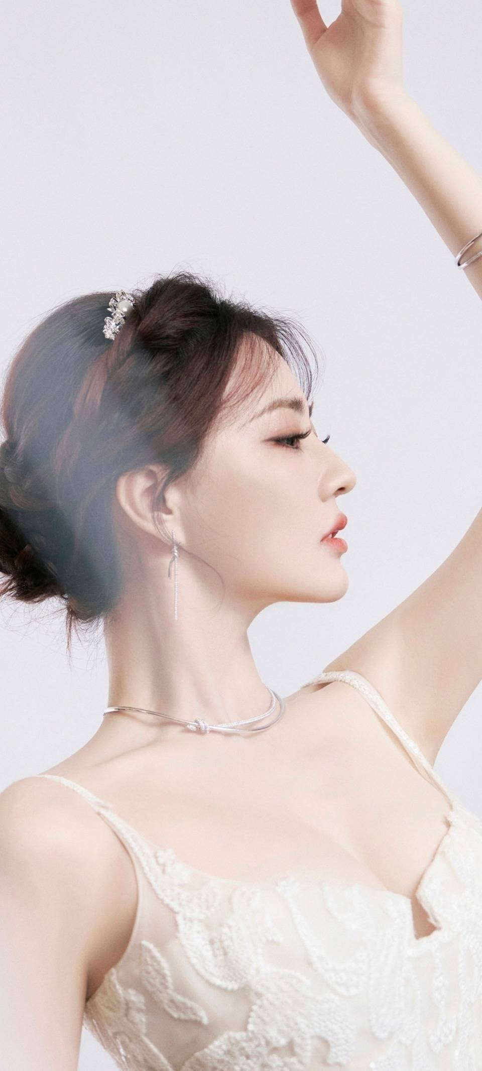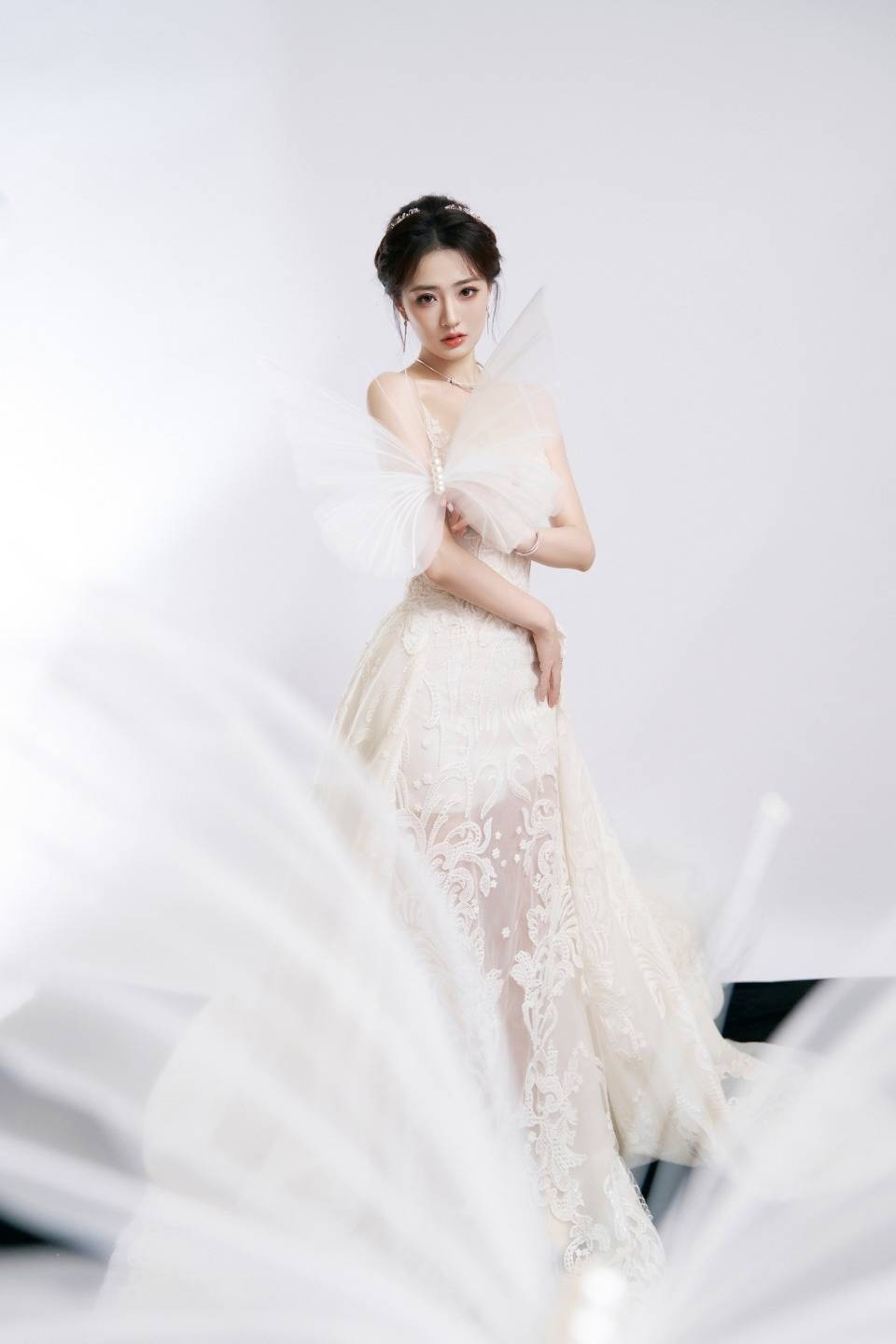 而且她超会拍!不是那种硬凹出来的性感,而是带着点慵懒的松弛感。有张照片她单手托着脸颊,头发松松挽成丸子头,几缕碎发垂在颈边,眼神半眯着像刚睡醒的小猫,偏偏耳坠和项链又闪得晃眼,这种又纯又欲的反差感直接戳中我心巴!还有张侧身照更绝,她微微抬着手臂,白色礼服的薄纱袖子像蝴蝶翅膀似的展开,背景是纯色的,整个画面干净得像幅油画,连指尖的戒指都精致得像在说“快来夸我”。